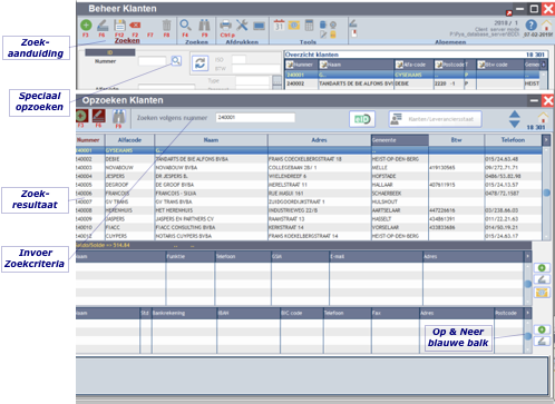 Indien u klikt op de knop met het vergrootglas naast het Nummer-veld hebt u de mogelijkheid om te zoeken in de lijst met alle klanten.