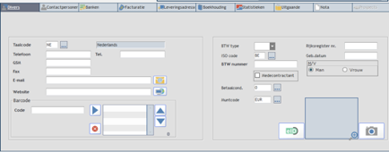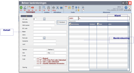 - Lijst met bankrekeningen van de klant. Van de banken worden hier Naam, Standaard, Bankrekening, IBAN, BIC-code, Telefoon, Fax, Adres, Postcode, Gemeente en Land getoond.