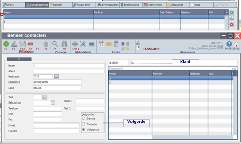 - Lijst met contactpersonen van de klant. Van de contactpersonen worden hier Naam, Functie, Geboortedatum, Telefoon, GSM, Fax, E-mail, Adres, Postcode en Gemeente getoond.