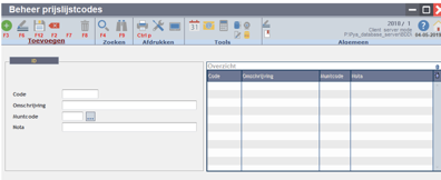 Prijslijsten dienen vooraf aangemaakt te worden in Beheer prijslijstcodesP2331en deze dienen op hun beurt te worden gekoppeld aan PrijsafsprakenP2333. - Tarief prijslijst
