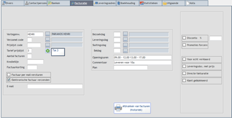 Per prijslijstcode zijn maximaal 6 tarieven mogelijk. Deze kunnen ingesteld worden in Instellingen stock, facturatie, orderbeheerP9320. - Aantal facturen - Aantal afdrukken van een factuur die voor een klant moeten gemaakt worden.