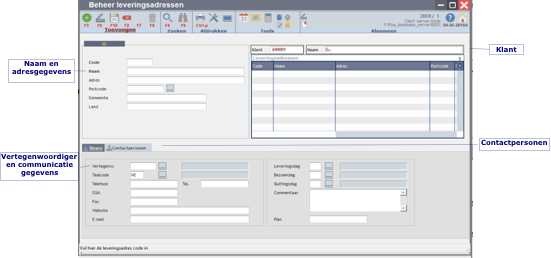 - Lijst met leveringsadressen van de klant. Van de leveringsadressen worden hier Code, Naam, Telefoon 1, Telefoon 2, GSM, Fax, Adres, Postcode, Gemeente en Land getoond.