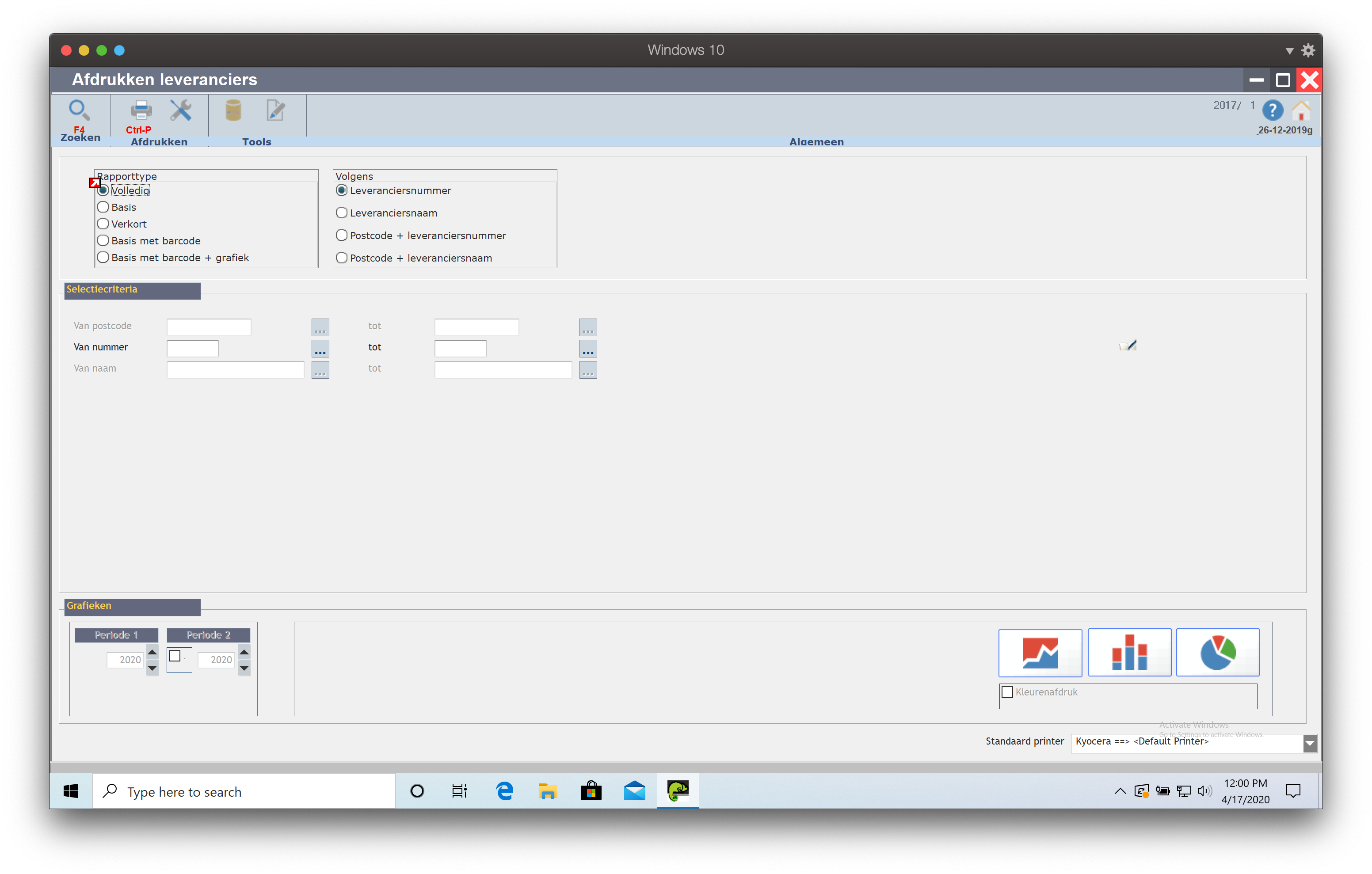 Hier kan u het gewenste rapporttype, de sorteervolgorde, de selectiecriteria en het grafiektype instellen voor het afdrukken van leverancierslijsten.
