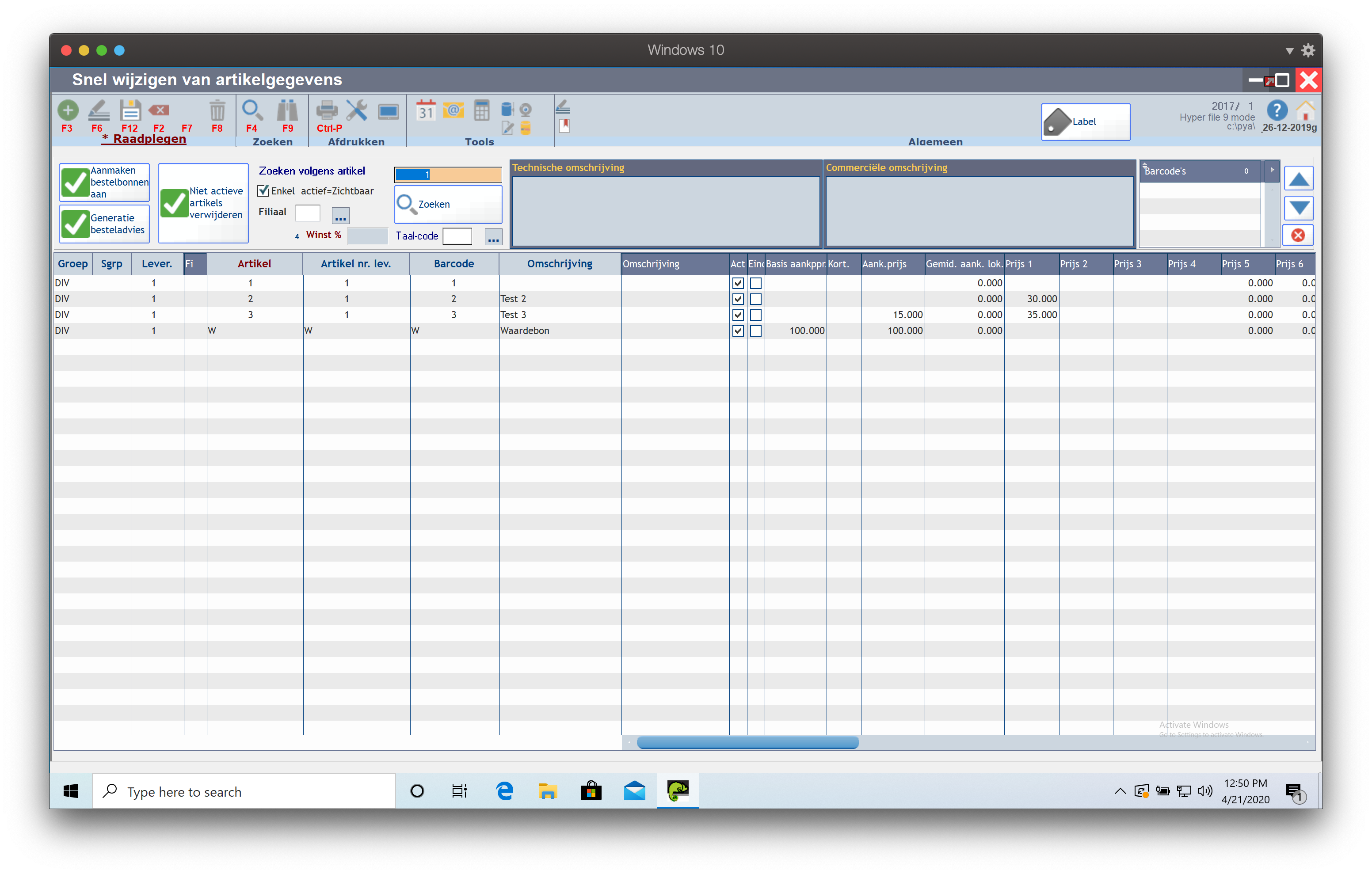 Van de artikels worden hier Groep, Leveranciernummer, Filiaal, Artikelcode, Artikelnummer leverancier, Barcode, Omschrijving, Actief, Einde reeks, Basis aankoopprijs, Korting, Aankoopprijs, Gemiddelde aankoopprijs locale valuta, Prijs 1, 2, 3, 4, 5, 6, 7 en 8, Stock, PLU, Minimum voorraad, Maximum voorraad, Bestelpunt, Minimum bestelling, Seizoen, Merk, Gewichtscode, Gewicht, Eenheid in, Aantal in, Eenheid uit, Aantal uit, BTW, Boekhoudkundige rekening, Etiketten, Locatie, Besteldatum, Verwerkdatum, Aantal besteld, Niet op het internet, Niet te koop op het internet, Niet te koop op het internet indien niet in stock, Geen prijzen tonen op het internet, Foto en Textiel getoond.