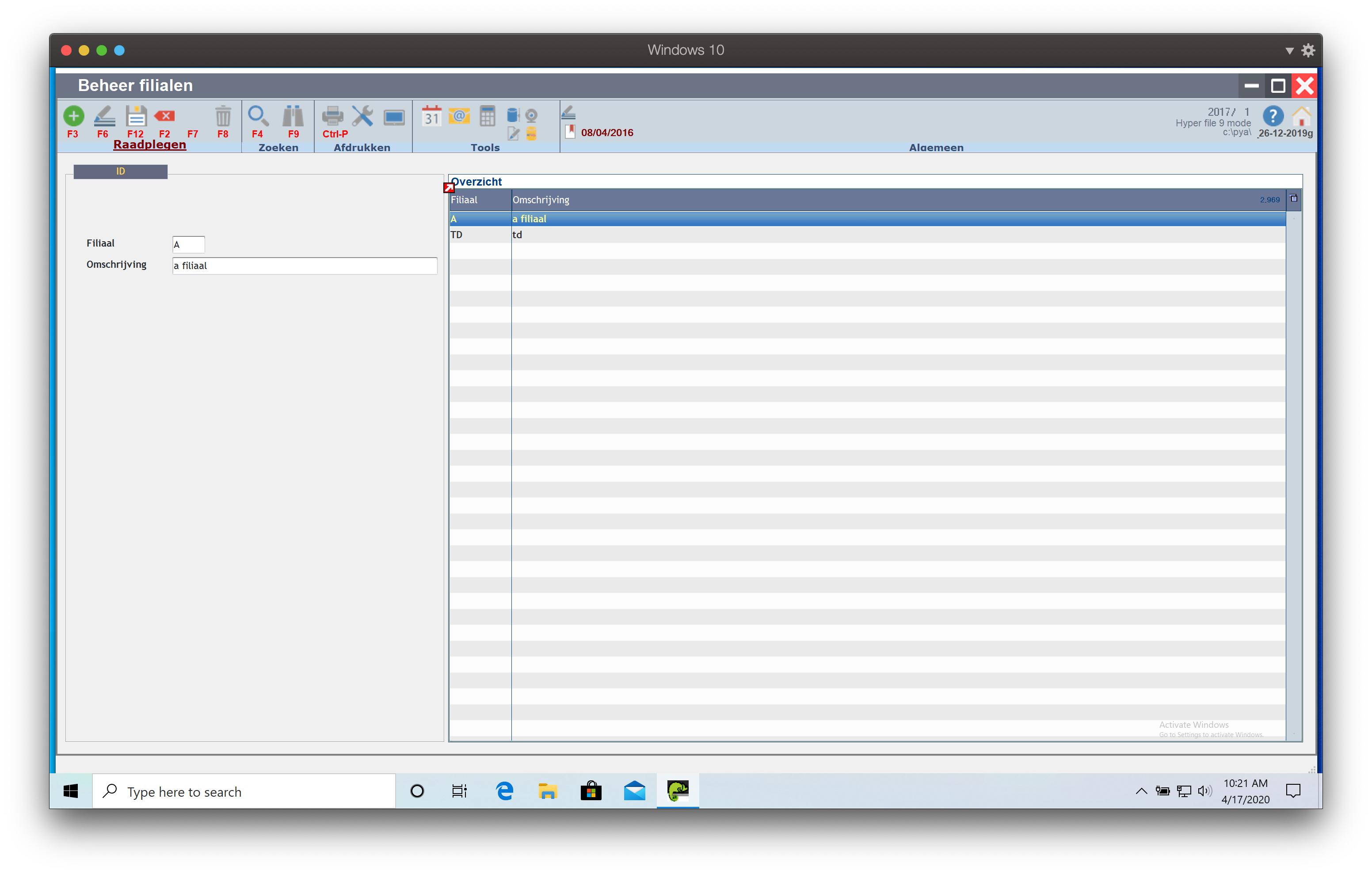 In de rechterbovenhoek van het scherm ziet u een lijst met alle filialen. Van de filialen worden hier Filiaal en Omschrijving getoond.
