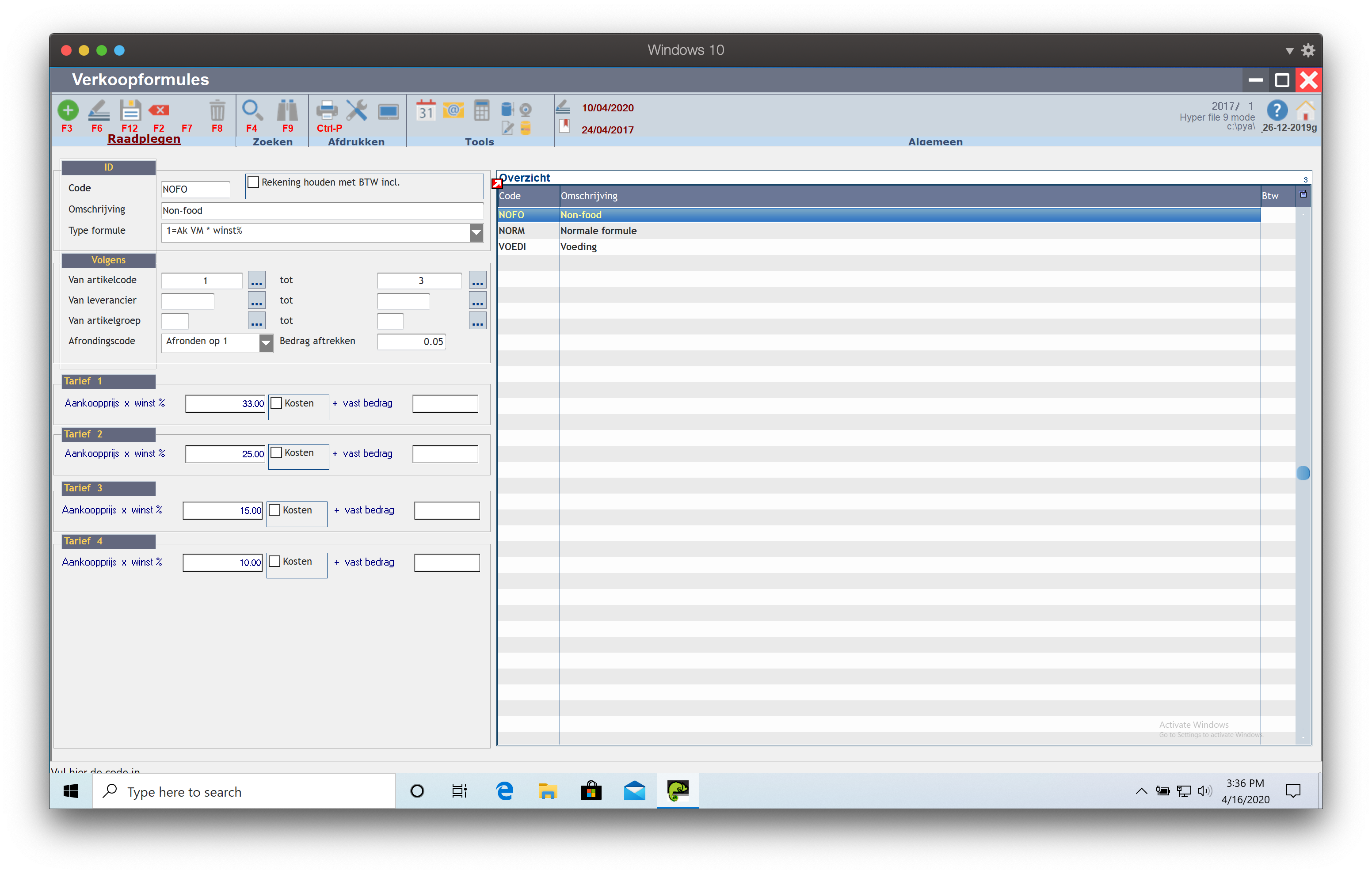 - Tarief 1, 2, 3 en 4 - Voor de verschillende tarieven kan u hier het respectievelijke winstpercentage ingeven en of er kosten moeten worden bijgeteld en eventueel een vast kostenbedrag.