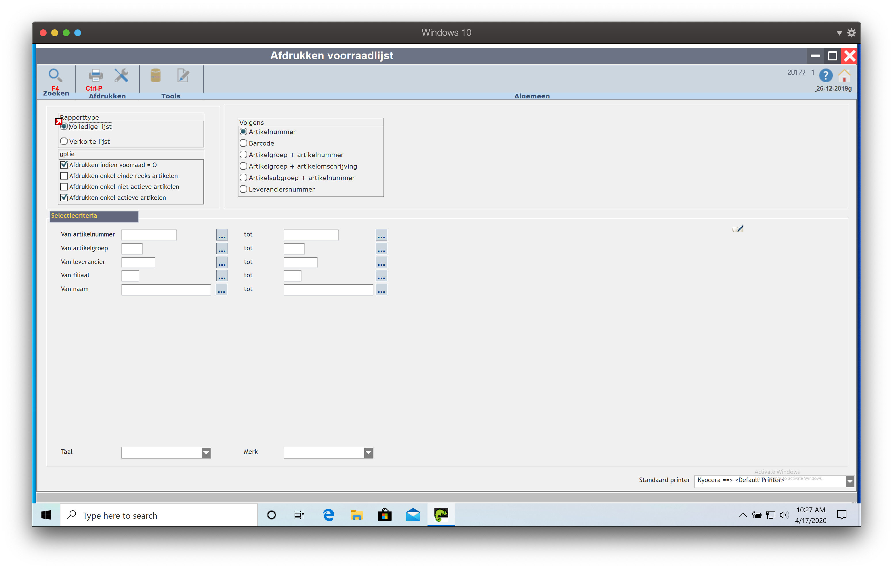Hier kan u het gewenste rapporttype, de opties, de sorteervolgorde en de selectiecriteria instellen voor het afdrukken van voorraadlijsten.