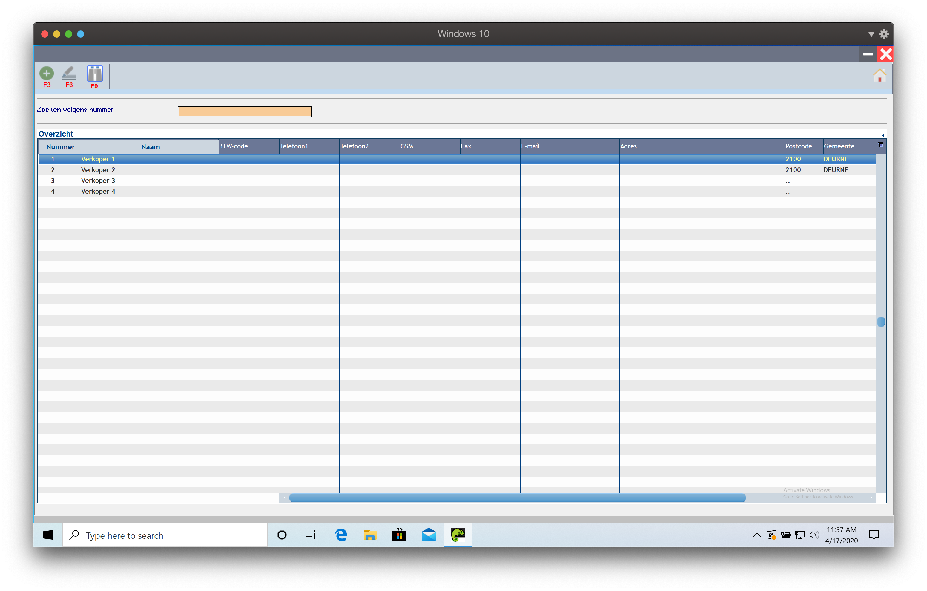 Lijst met alle verkopers. Van de verkopers worden hier Nummer, Naam, BTW-code, Telefoon1, Telefoon2, GSM, Fax, E-mail, Adres, Postcode, Gemeente en Land getoond.